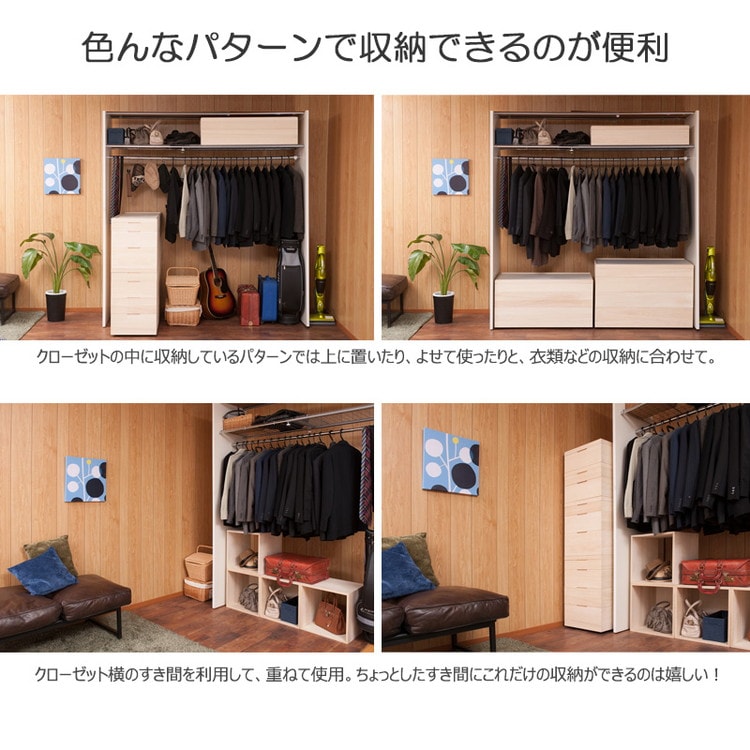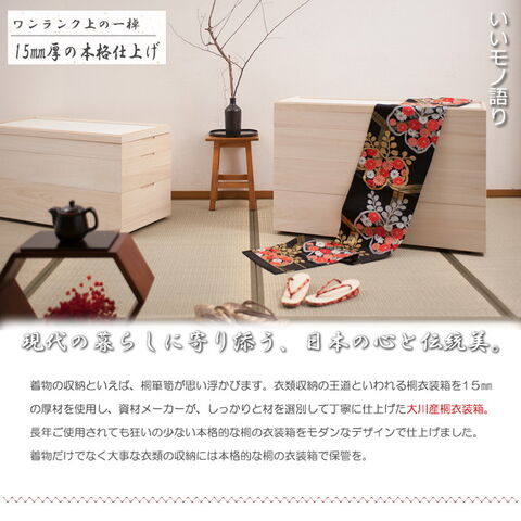 経年変化の風合いを楽しめる白木タイプ、ナチュラル・ブラウンの塗装仕上げタイプと3カラーをご用意。買い足し積み重ねて増える着物と洋服をしっかり収納。