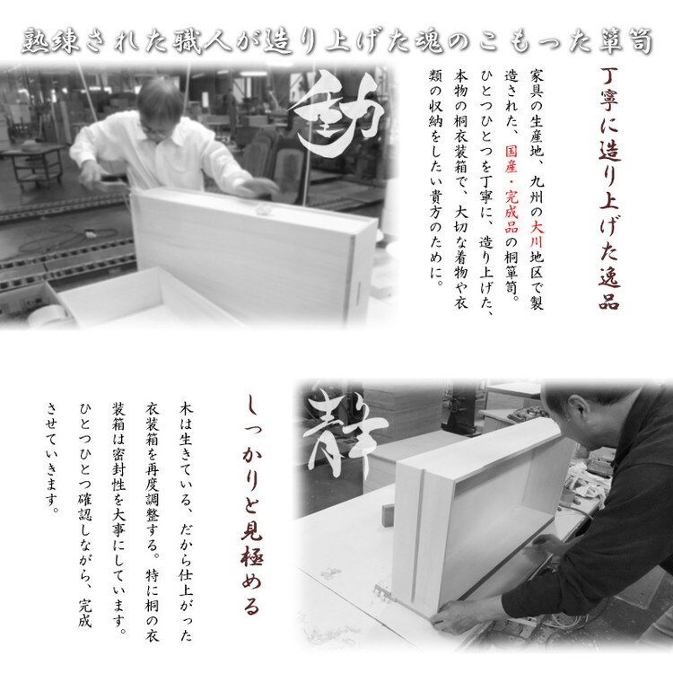 内部背板には竹炭シートを施しているので、消臭効果もプラス!クローゼットにもおさまるコンパクトサイズからラインナップし、着物や浴衣、洋服など長期保管に最適です。