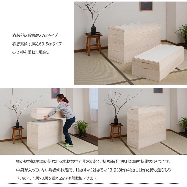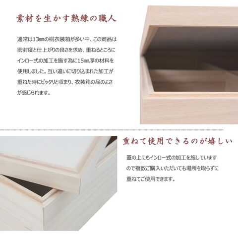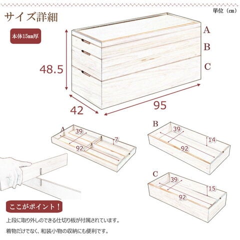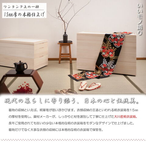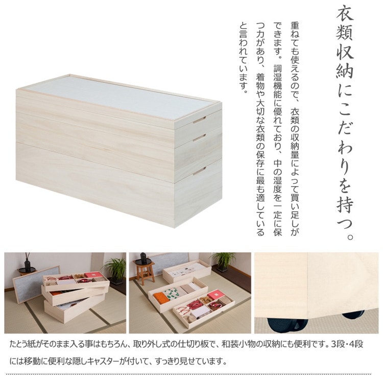 経年変化の風合いを楽しめる白木タイプ、ナチュラル・ブラウンの塗装仕上げタイプと3カラーをご用意。買い足し積み重ねて増える着物と洋服をしっかり収納。