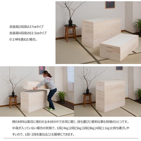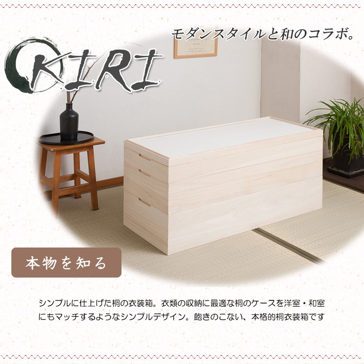 取っ手金物のないシンプルに仕上げたモダンな印象の桐箪笥。洋室などのフローリングにも合うデザインはリビングの中心にもはまる仕上がり。
