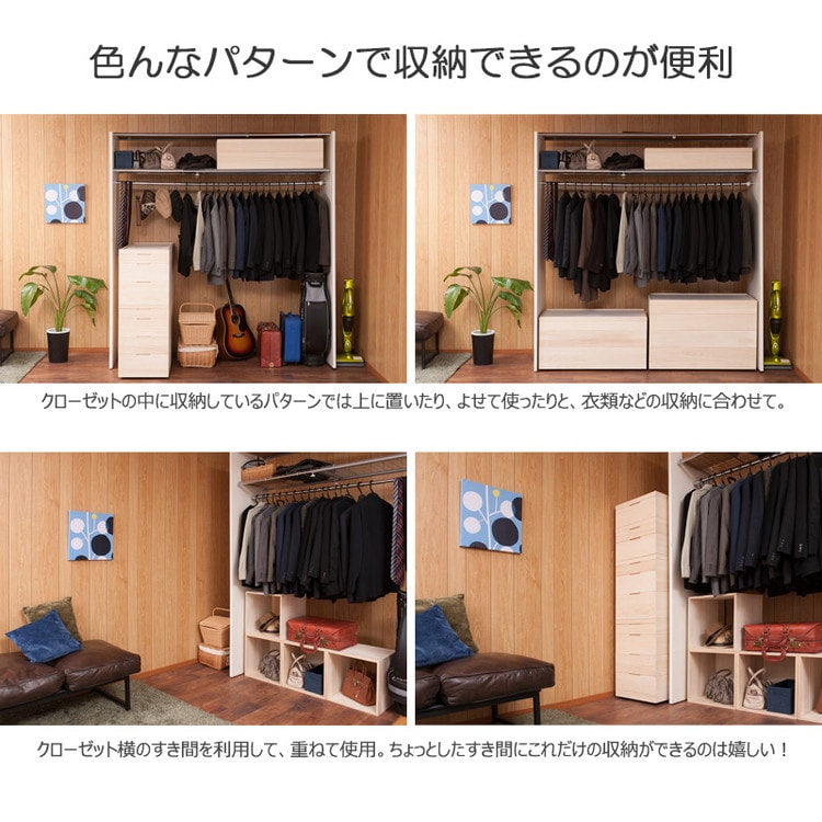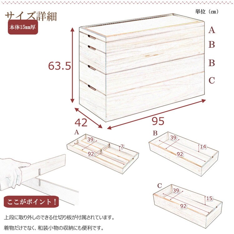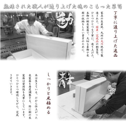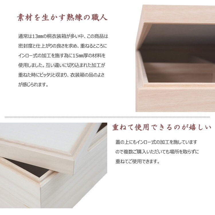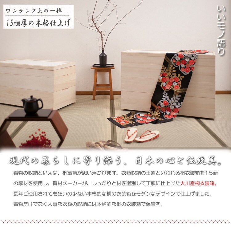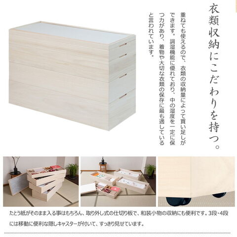 経年変化の風合いを楽しめる白木タイプ、ナチュラル・ブラウンの塗装仕上げタイプと3カラーをご用意。買い足し積み重ねて増える着物と洋服をしっかり収納。