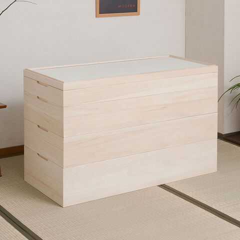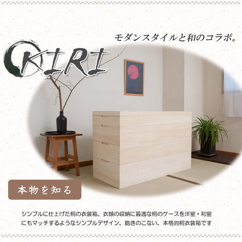 取っ手金物のないシンプルに仕上げたモダンな印象の桐箪笥。洋室などのフローリングにも合うデザインはリビングの中心にもはまる仕上がり。