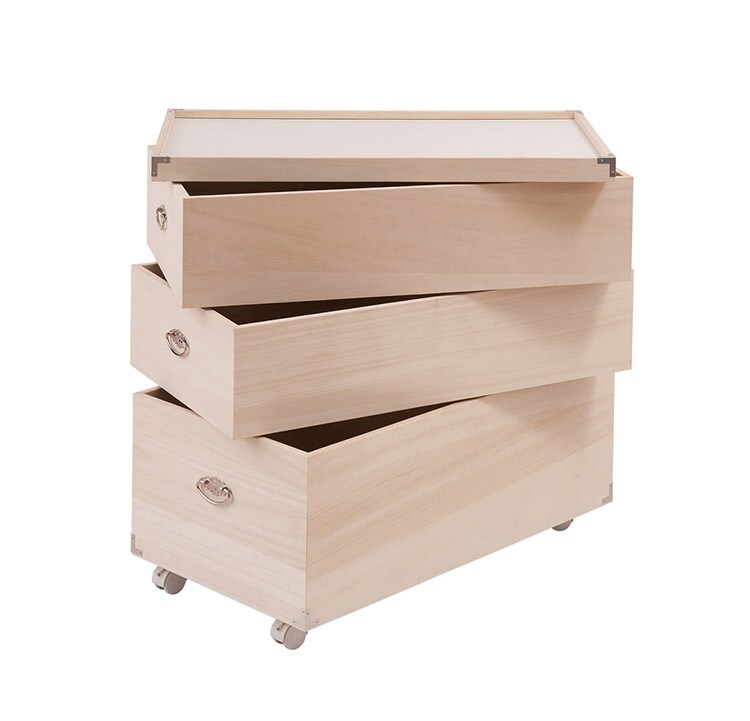 桐材は内部を一定の湿度に保とうとする働きがあるので、ひな人形や大事な着物などを湿気から守る桐箱にしまうのがベスト。竹炭シートを施しているので、消臭効果もプラス!もちろん押し入れやクローゼットに入るサイズで仕上げ、長期保管に最適です。冬物のかさばる大きな布団や毛布、衣類など保管したいものは全てここに。シルバー色の取っ手、隅にシルバー色の飾り金具を手打ちした豪華仕様。キャスター付きなので移動や出し入れが楽々!桃の節句のお雛さんや端午の節句の兜を収納に。