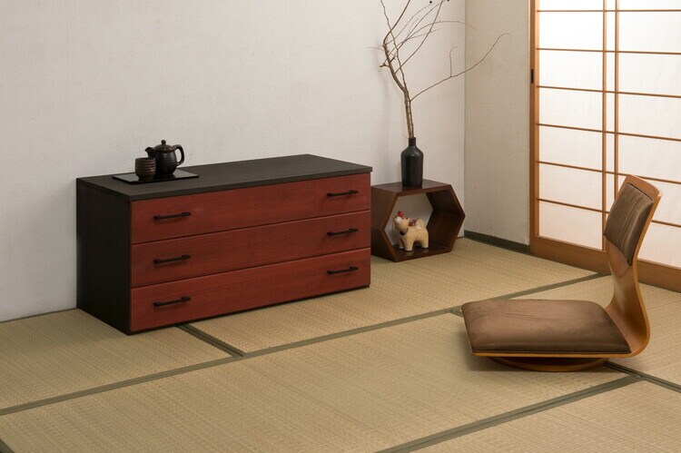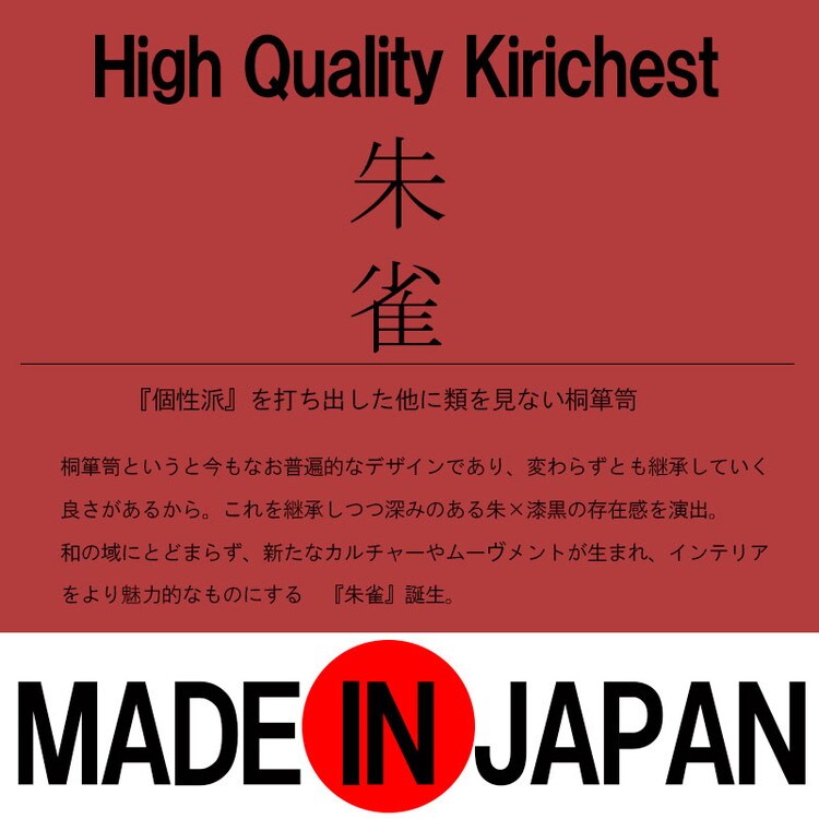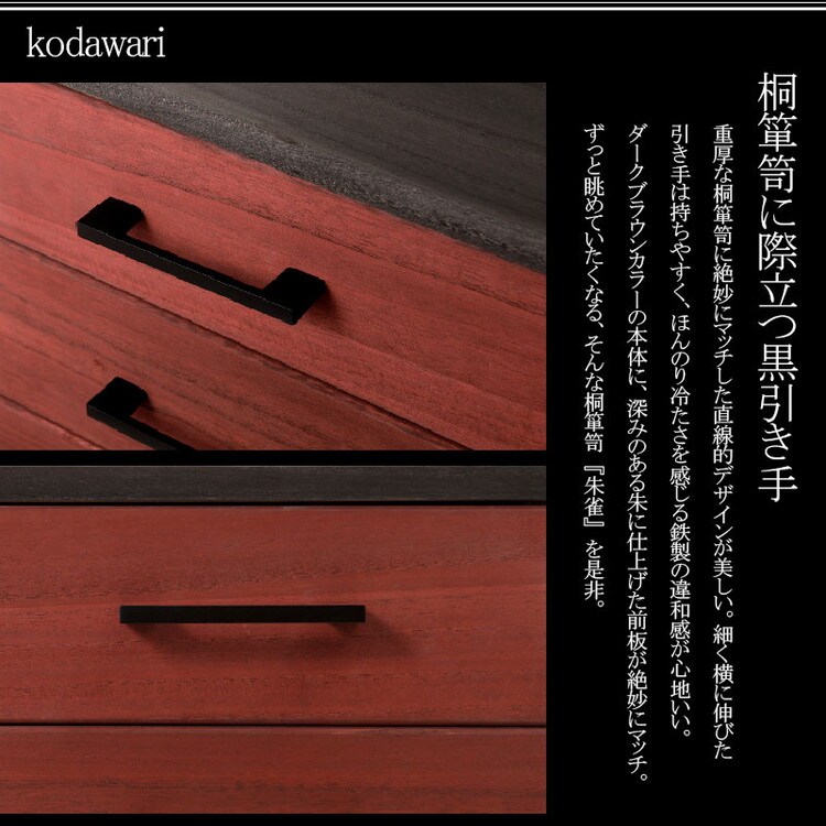桐箪笥というと今もなお普遍的なデザインであり、変わらずとも継承していく良さがあるから。これを継承しつつ深みのある朱×漆黒の存在感を演出。