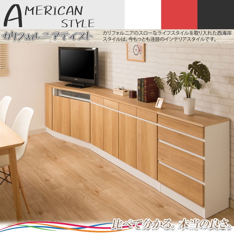 ナチュラルでカリフォルニアインテリアをイメージした薄型キッチンリビングボード【gym】ジムシリーズ。ライトな感覚でインテリアになじみやすいナチュラル木目&カラーを主としてLDに映えます。