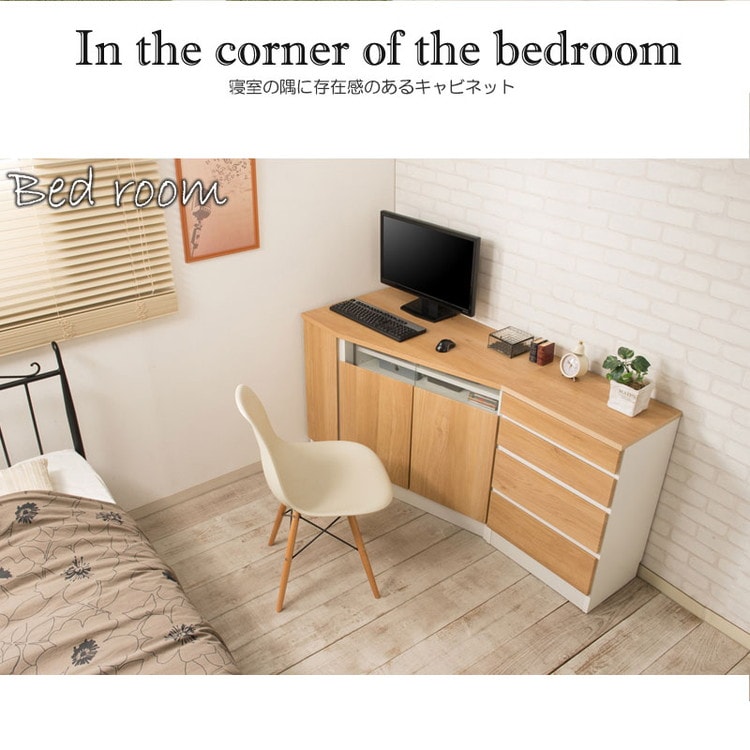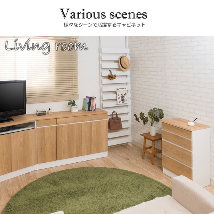 4段チェストやガラスと一体化したコーナーキャビネット、引出し付きキャビネットなどシンプルながら機能性もしっかりと装備し、リビングボードとして、TVボードとして、またキッチンカウンターとして様々な使い方が可能。