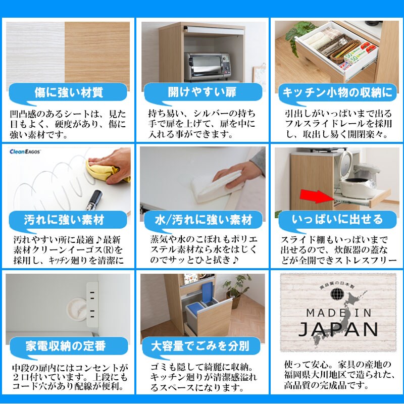 フラップ扉内部、引出し収納部:強化プリント紙化粧繊維板(汚れ防止加工クリーンイーゴス)