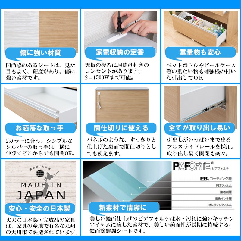 天板は、水や汚れに強い高級ピアフォルテ、引出し内部も汚れに強いクリーンイーゴスを採用。