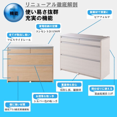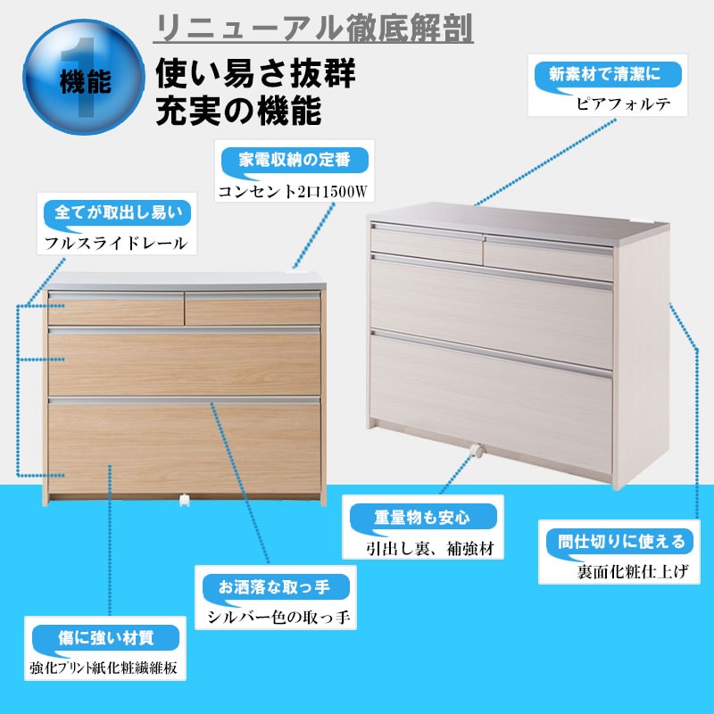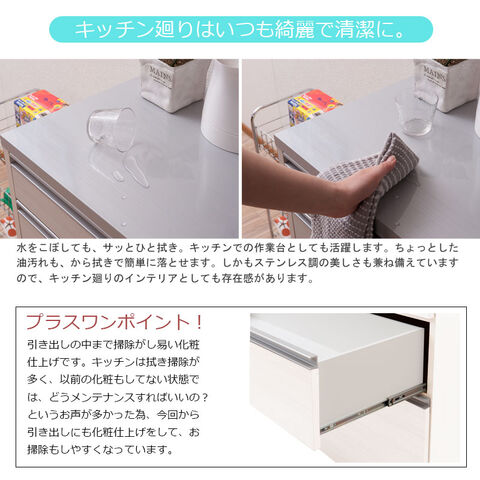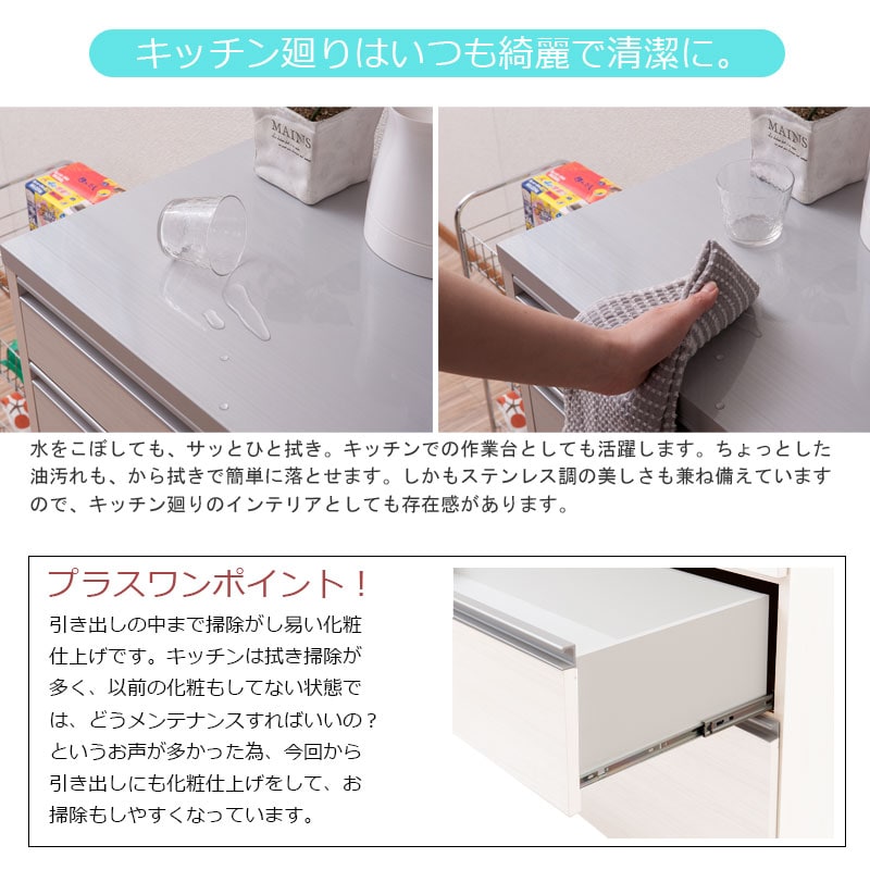 天板は、水や汚れに強い高級ピアフォルテ、引出し内部も汚れに強いクリーンイーゴスを採用。