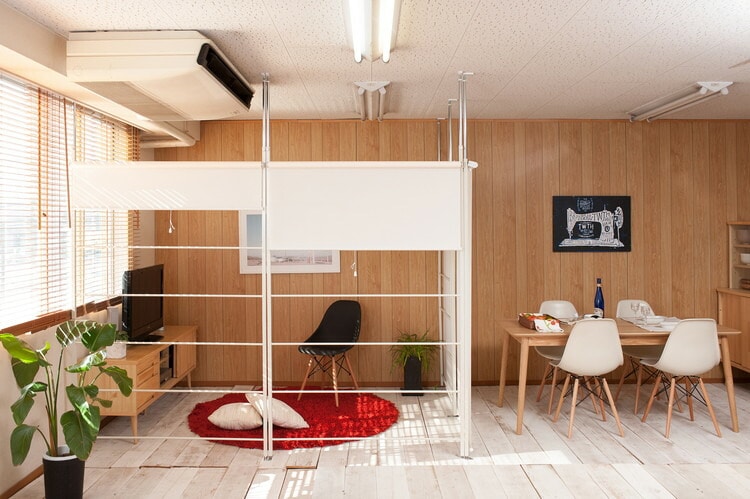 インテリアを重視したパーテーションはラダー状でおしゃれな印象。ショップやカフェ風で光がラダーのすきまから差し込み明るく間仕切れます。