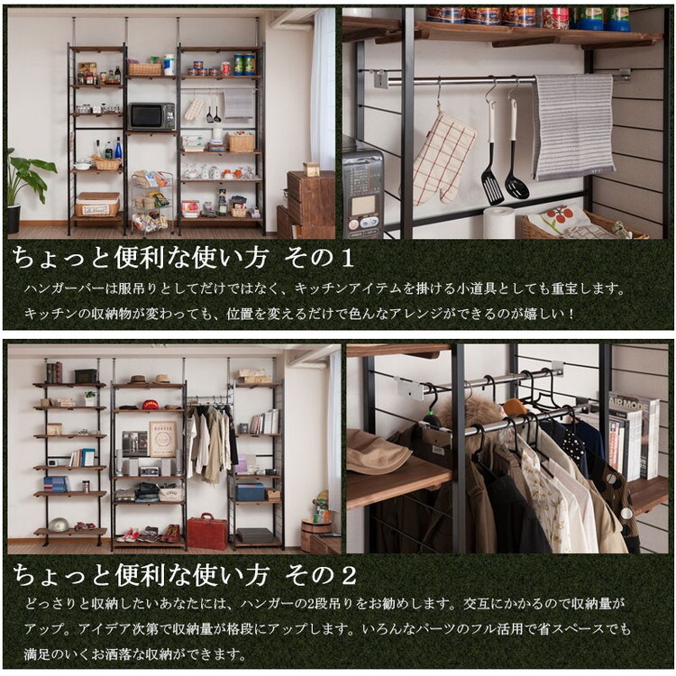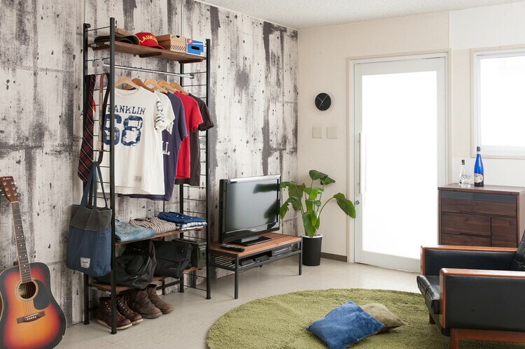 棚板を10cm間隔で好みの位置に自由にセットできる楽しい家具。ディスプレイ空間とハンガーラックで見せるワードローブなどオシャレな店舗風にお部屋をイメージ。