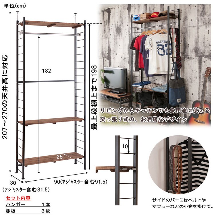 本体:(約)幅90(アジャスター含む91.5)×奥行30(アジャスター含む31.5)×高さ207~270cm