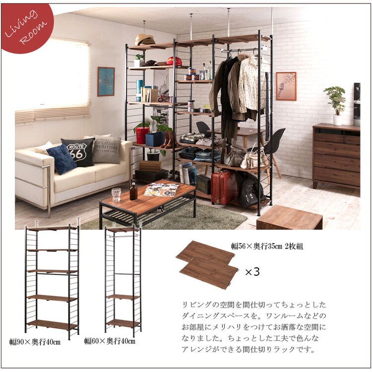 棚板を10cm間隔で好みの位置に自由にセットできる楽しい家具。ディスプレイ空間とハンガーラックで見せるワードローブなどオシャレな店舗風にお部屋をイメージ。
