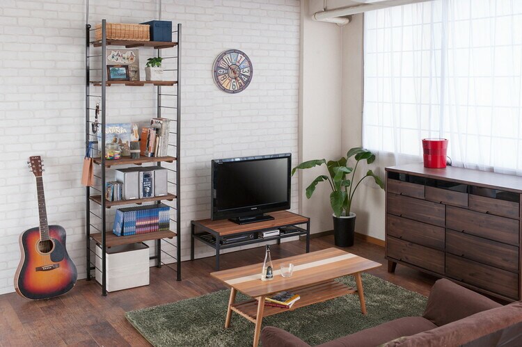 棚板を10cm間隔で好みの位置に自由にセットできる楽しい家具。ディスプレイ空間とハンガーラックで見せるワードローブなどオシャレな店舗風にお部屋をイメージ。