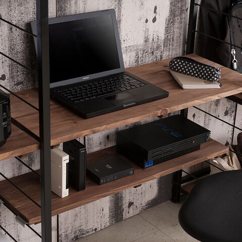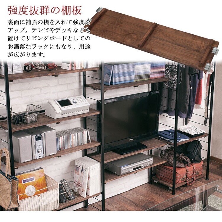 棚板を10cm間隔で好みの位置に自由にセットできる楽しい家具。ディスプレイ空間とハンガーラックで見せるワードローブなどオシャレな店舗風にお部屋をイメージ。