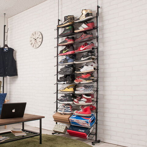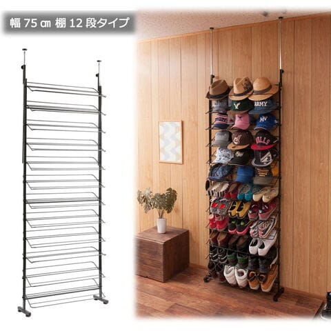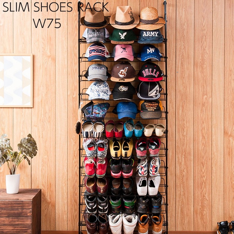 シューズラック 幅75 スリム 薄型 ブラック スチール つっぱり シューズラック 靴箱 ディスプレイラック 靴置き 靴収納 スニーカー 玄関 スリッパ 薄型 下駄箱 省スペース すきま ウォールラック【送料無料】