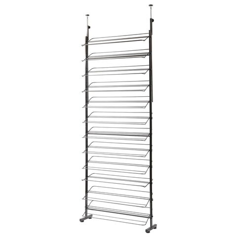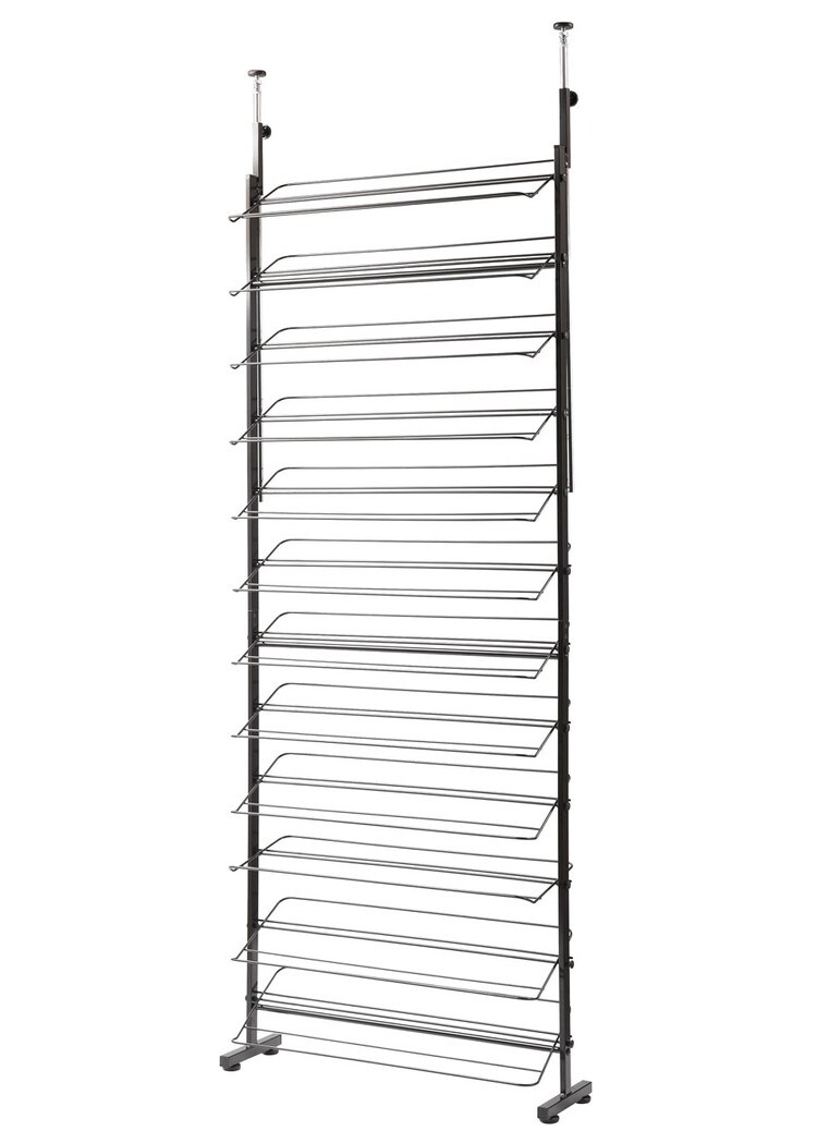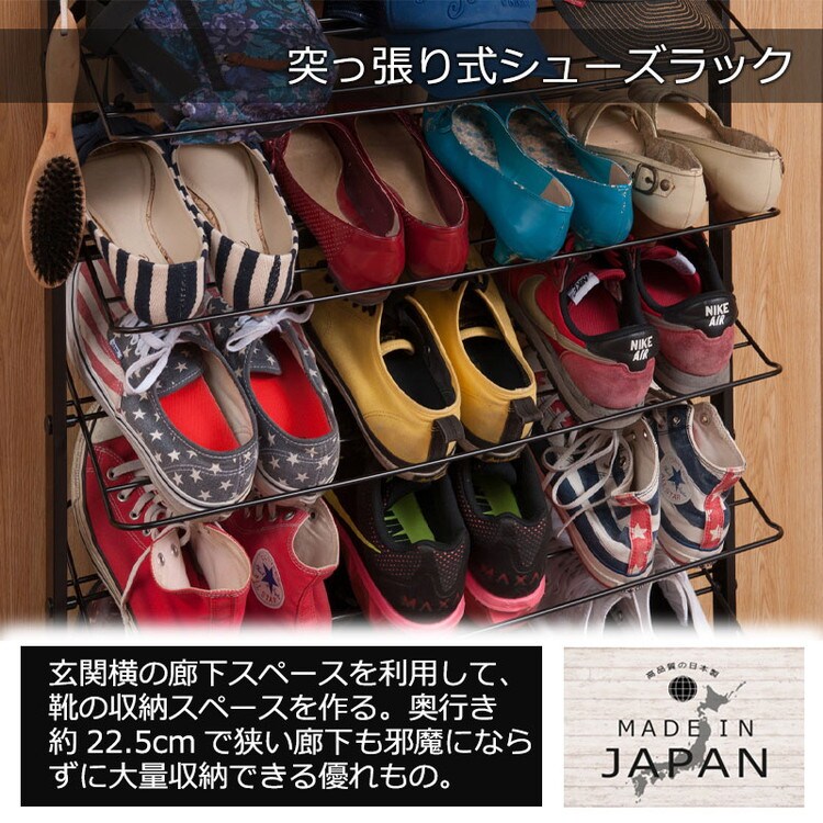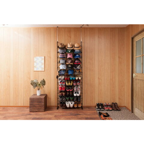 スチールの強さを打ち出すソリッド感が魅力のブラックカラー。薄型設計で突っ張り式の機能的シューズラック。