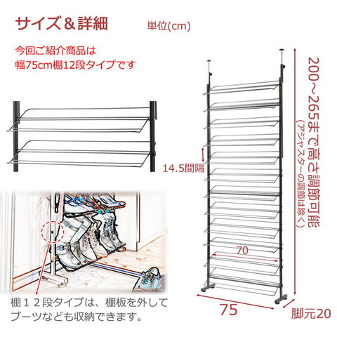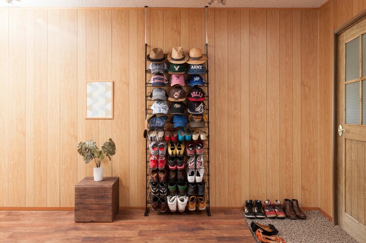低めの玄関框をまたいだ状態でも設置できるように微調整可能なアジャスターがついており、突っ張り式で安心。3サイズ展開で収納量に応じて選べます。
