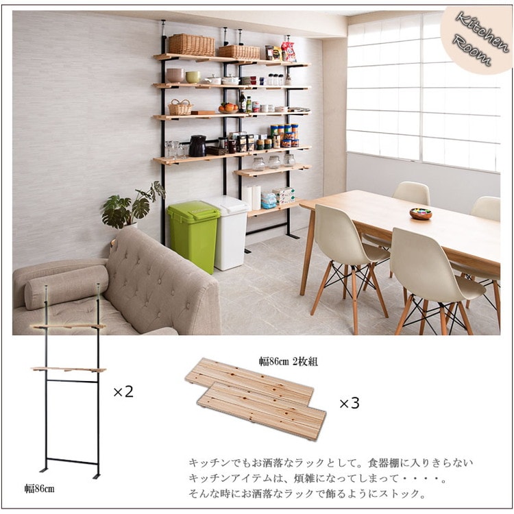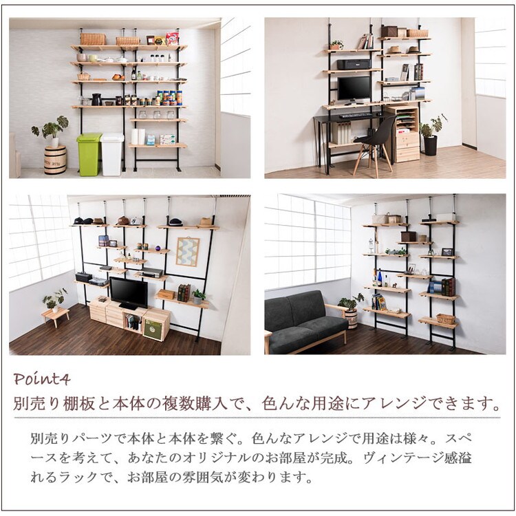 棚板を好みの位置に自由にセットできる楽しい家具。家具上の空間をラックにしたり、棚板を追加して壁面いっぱいにディスプレイしたりと使い方は無限大!