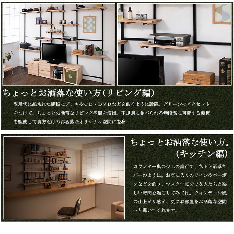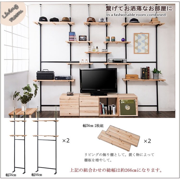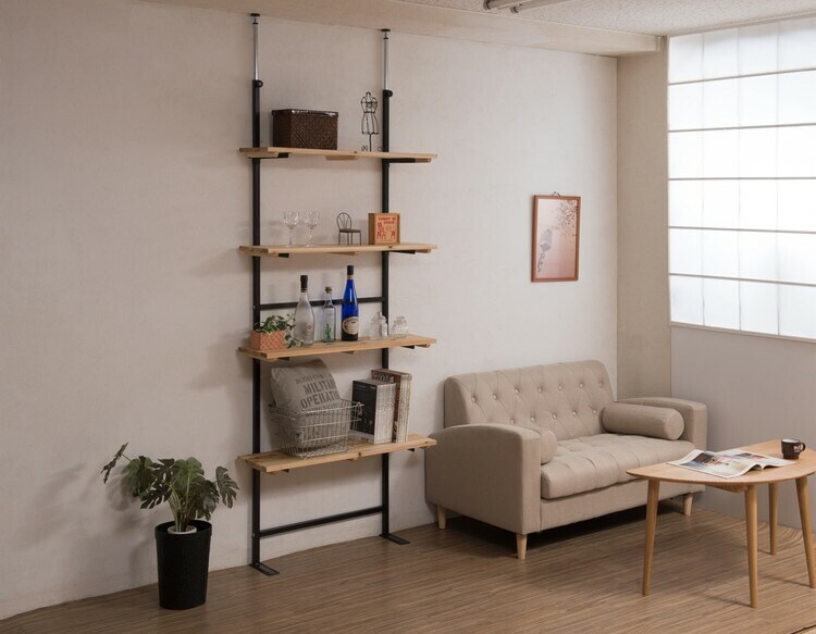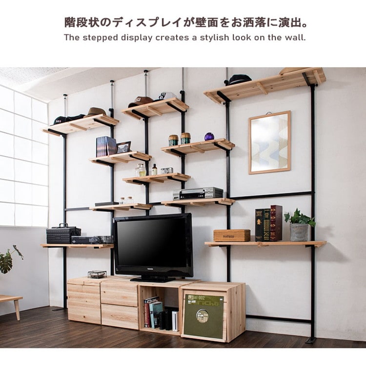 棚板を好みの位置に自由にセットできる楽しい家具。家具上の空間をラックにしたり、棚板を追加して壁面いっぱいにディスプレイしたりと使い方は無限大!