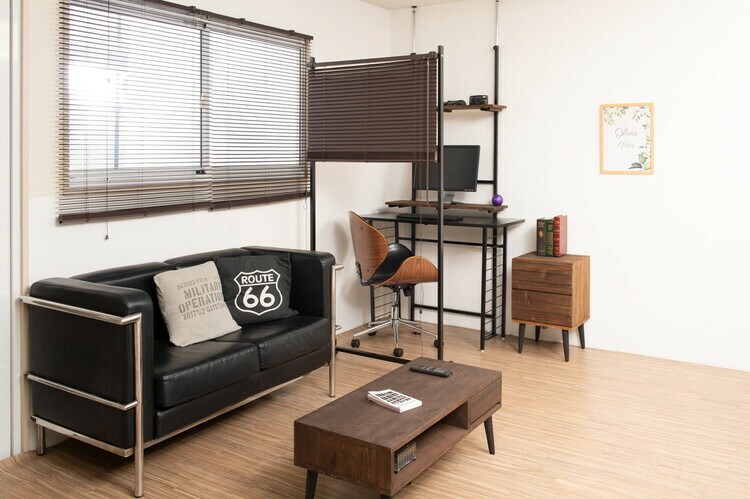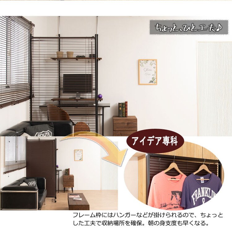 ブラインドを巻き上げれば開放的!ブラインドとして使うだけでなく、裏側にハンガーを掛けて翌日の洋服を掛けたりと、少しの工夫で空間をより快適に。