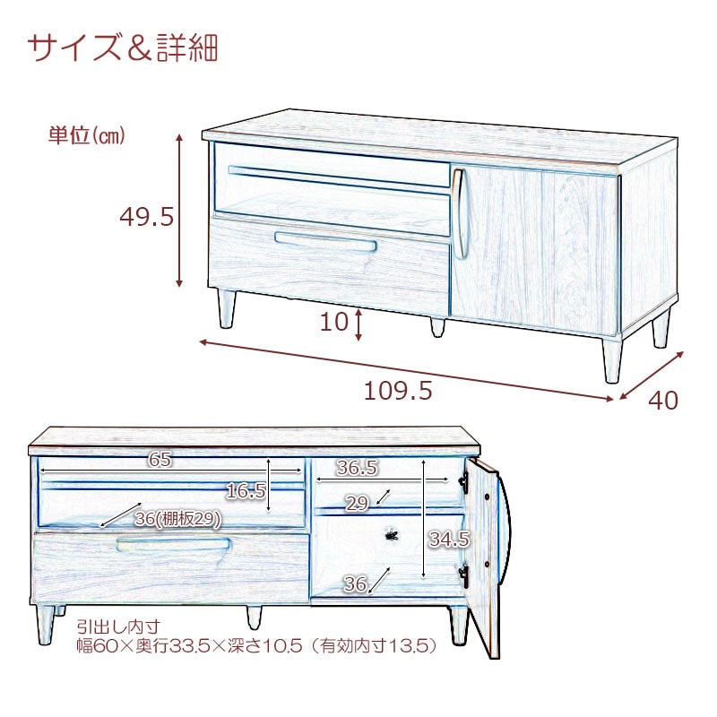 本体:(約)幅109.5×奥行40×高さ49.5(脚部約10含む)cm