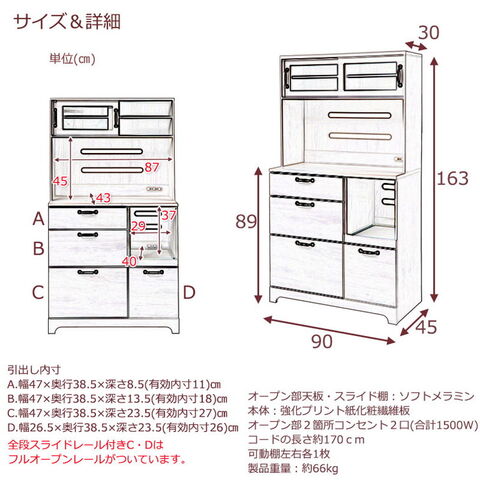 オープン部内寸:上部:(約)幅87×奥行43×高さ45cm、下部:(約)幅29×奥行40×高さ37cm