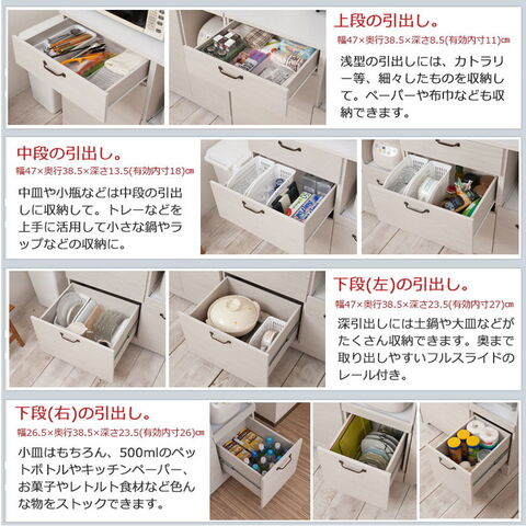 引出し内寸:(約)幅(左)47(右)26.5×奥行38.5×深さ(左上)8.5(有効11)、(左中)13.5(有効18)、(左下)23.5(有効27)、(右)23.5(有効26)cm