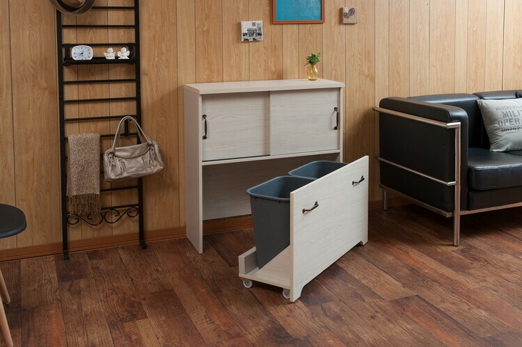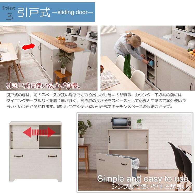 扉は引戸式にし、狭い部屋でも使いやすく、限られた空間に収納機能を凝縮。カウンター下やリビングなど様々なシーンで活躍する薄型キャビネットは幅90、110にダストボックスまで取りそろえ、インテリア度アップ。