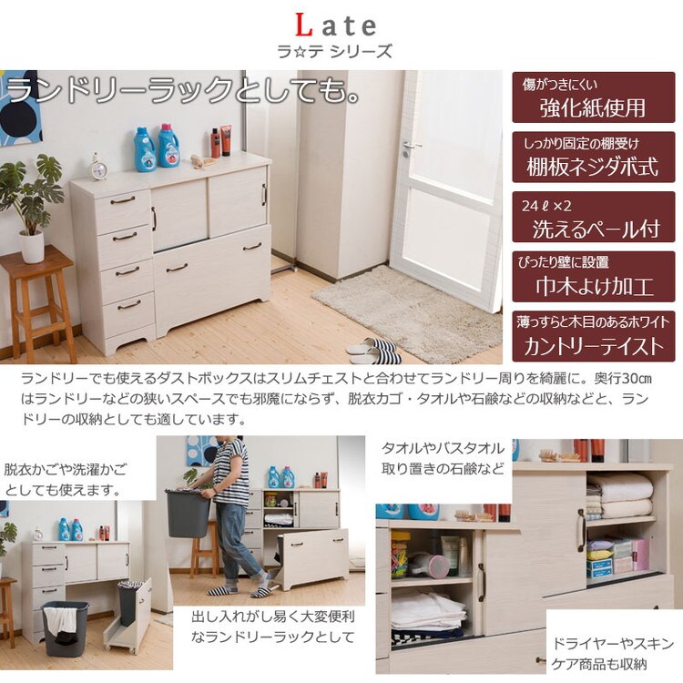 ゴミ箱が入っているとは思えないダストカウンターは大好評!家電や食器収納に最適なキッチンボードもラインナップ。『Late』シリーズは、やさしい木目で一人暮らし、二人暮らしにも使いやすいサイズ感がうけています。