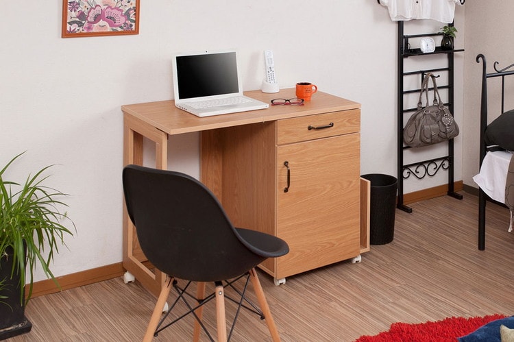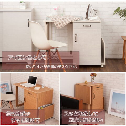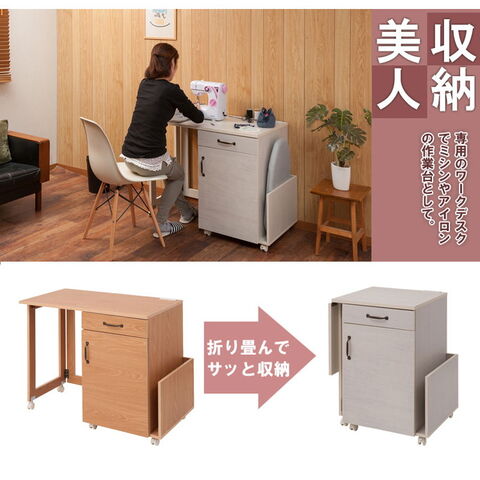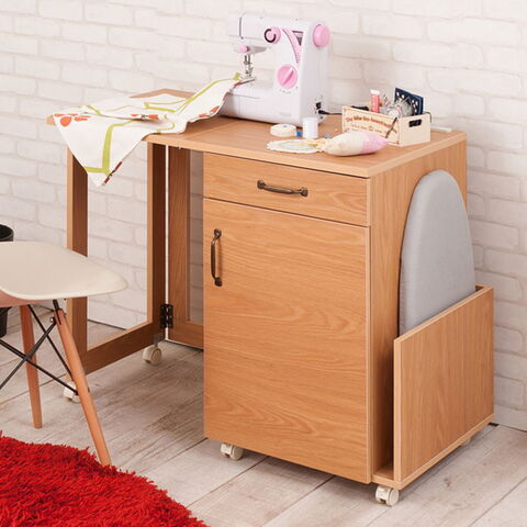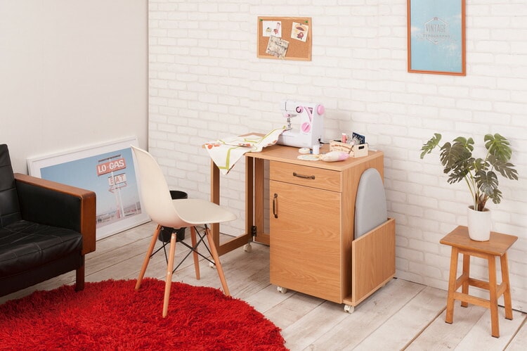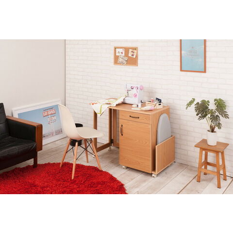 ミシン台として、アイロン台として、ダイニングサイドにカウンターとして、デスクとしても様々なシーンで使える便利なワゴン。使わないときは天板をたたんで、使う時だけ出せる省スペース設計。