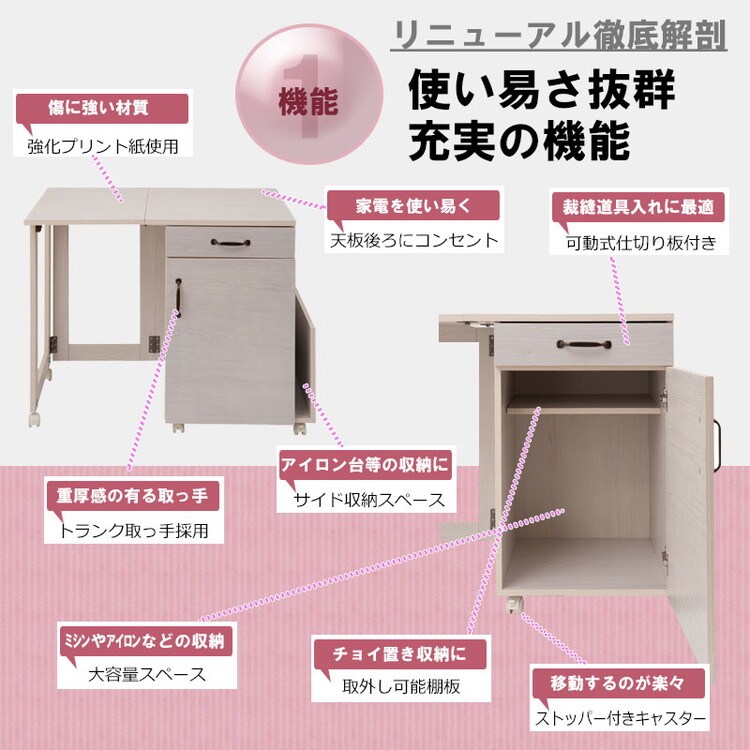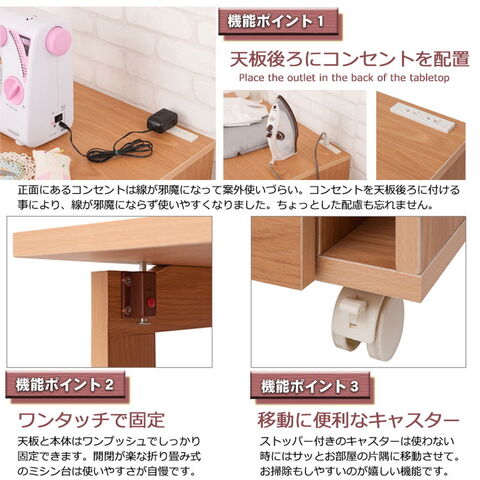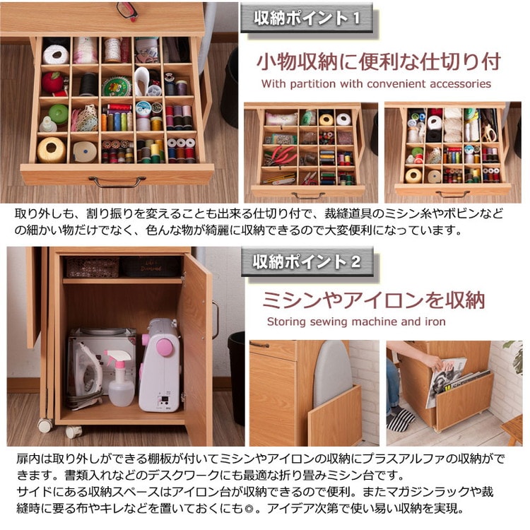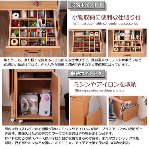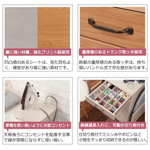 コンセントも付属し、ミシンやアイロンを使うのに最適な天板奥に配備。引出し内に組み換えや取り外しができる万能仕切り板が付属。扉内に棚板が付いて何かと収納に便利。