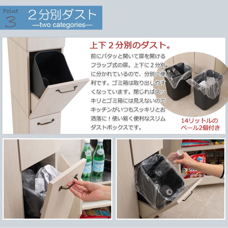 上扉は左右開きどちらにも対応。狭い部屋でも使いやすく、限られた空間に収納機能を凝縮。隠せるダストボックスは2分別で縦型の超スリムを実現。フラップ式で使いやすい扉はニオイを抑え見栄えもGOOD。