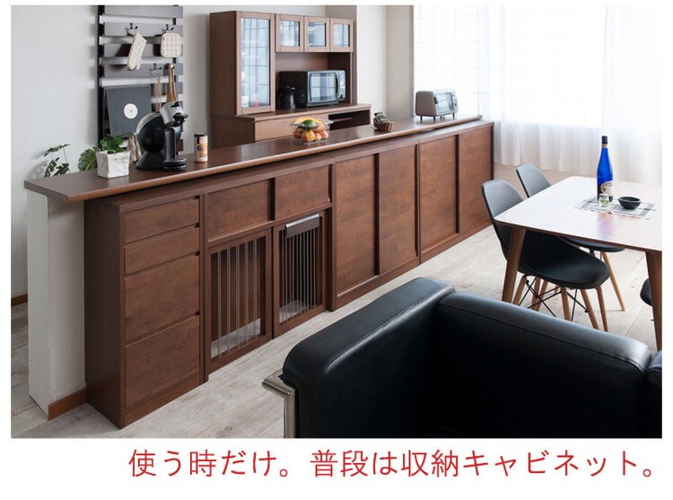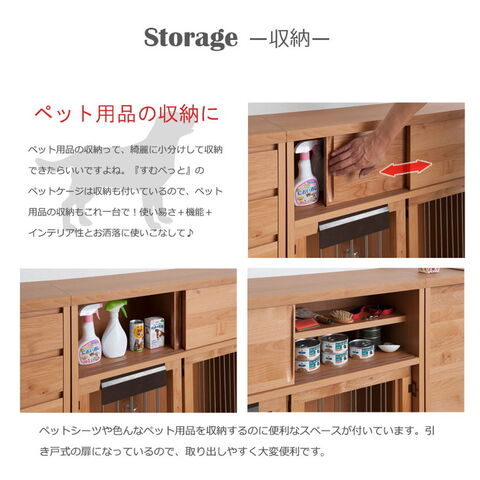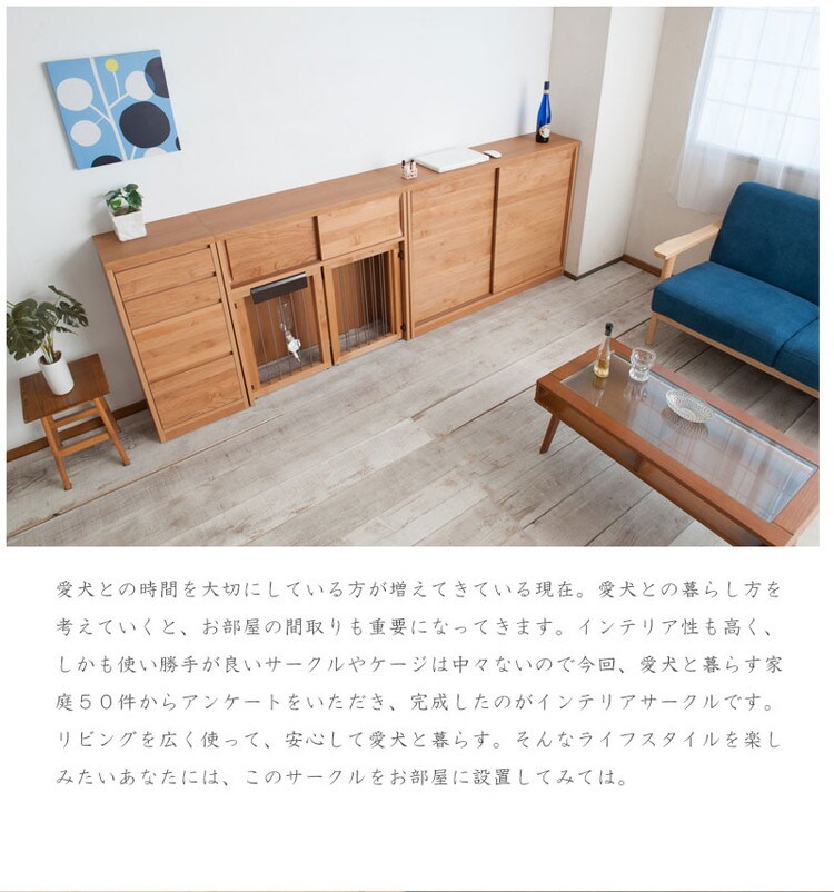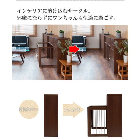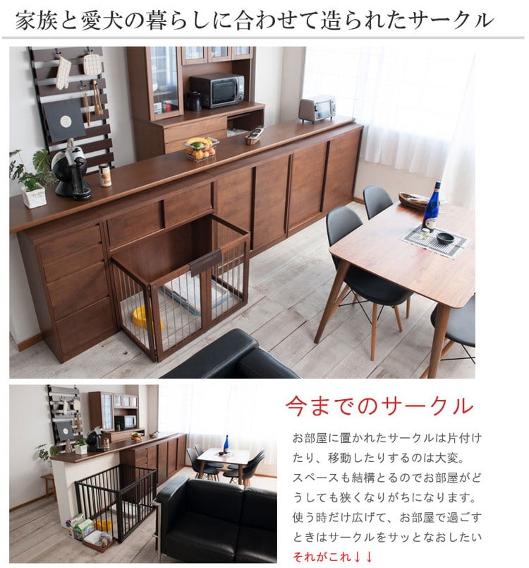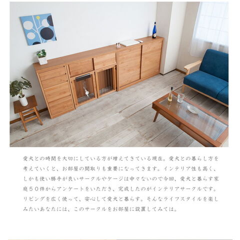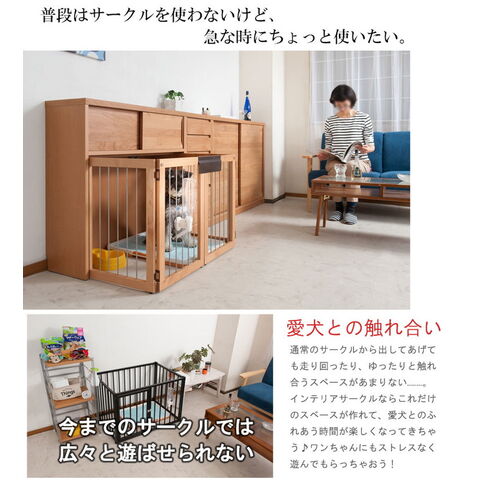 手をかけやすく、すっきりとした掘り込みの取っ手は天然木ならではの加工。愛犬をサークルに入れるときだけ広げるので、普段は収納キャビネットのように使えるのが魅力。