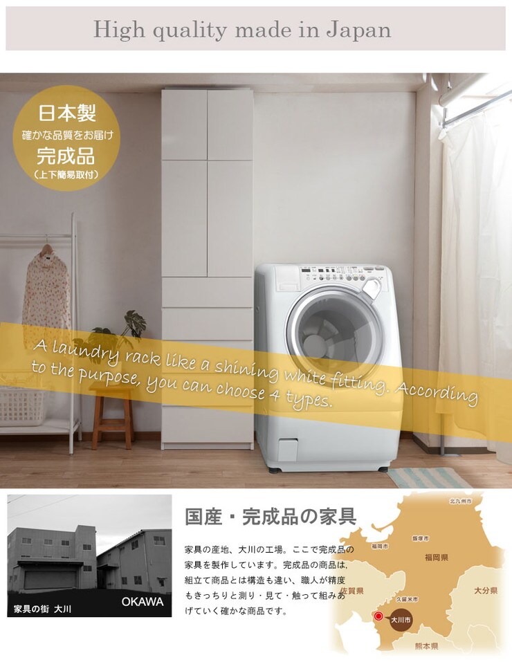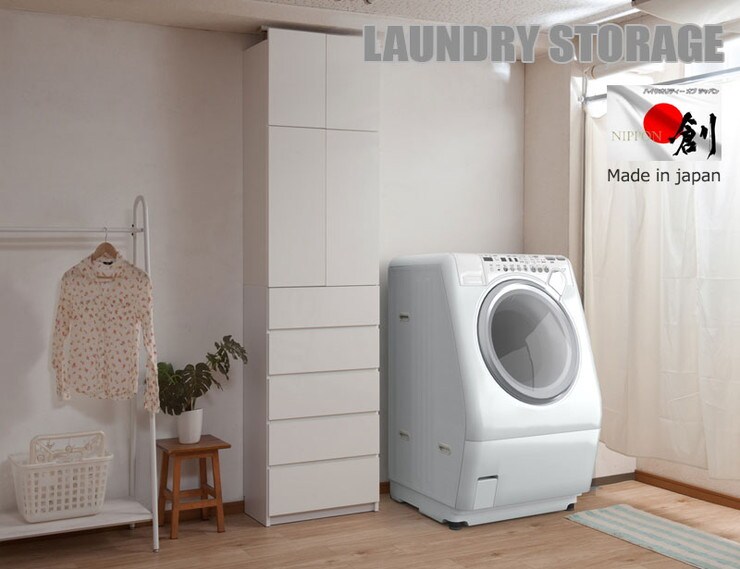 大川家具 完成品 日本製 突っ張り 薄型 ランドリーラック 扉 引き出し ランドリー 収納 白 ホワイト 国産 大容量 壁面収納 おしゃれ 北欧【送料無料】