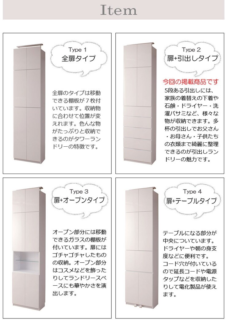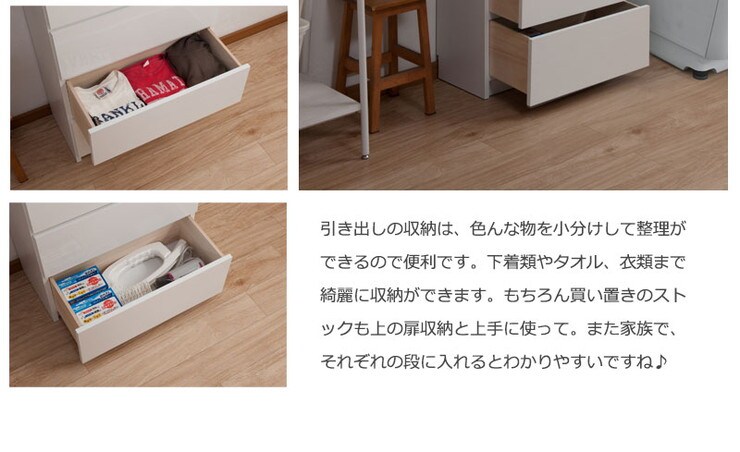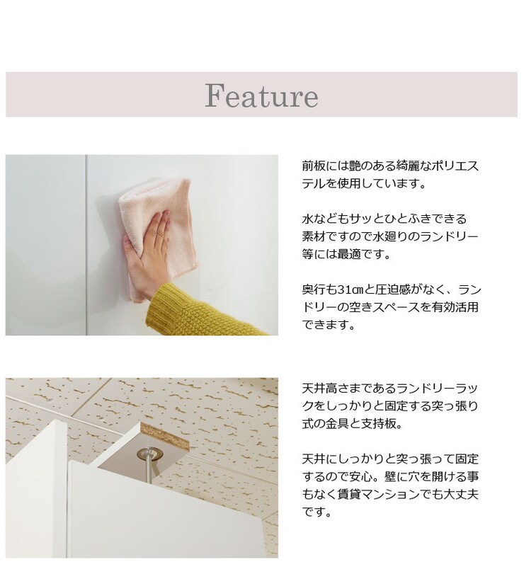 ■商品について/前板には水に強く、汚れもサッと拭き取れる光沢のあるポリエステルを使用。ランドリー廻りを整頓でき、常に綺麗に保てます。ランドリーに欠かせないのは、収納量。仕分けに便利な扉+引出タイプ、全扉タイプ、扉+オープンタイプ、扉+テーブル付タイプの4種で、使い勝手に合わせて選べます。奥行約31cmの省スペース設計で圧迫感なく天井近くまで収納できる棚が実現。