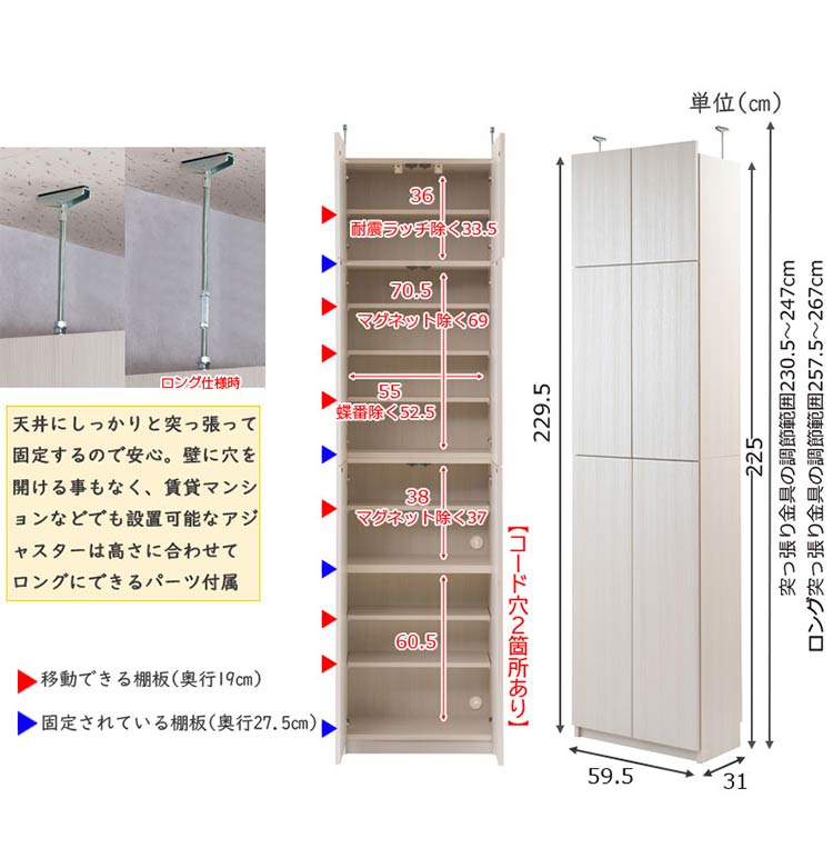 ロングアジャスター時突っ張り高さ調節範囲:約257.5~267cm