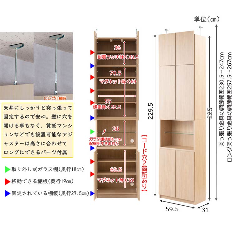 突っ張り高さ調節範囲(ロングアジャスター時):約257.5~267cm