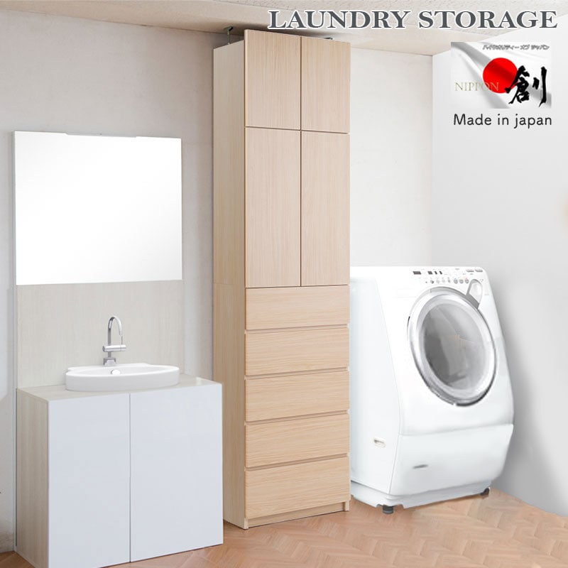日本製、完成品、壁面、薄型、ランドリーラック、ナチュラル、地震、つっぱりラック、突っ張り、チェスト、木目調、木製、おしゃれ、北欧