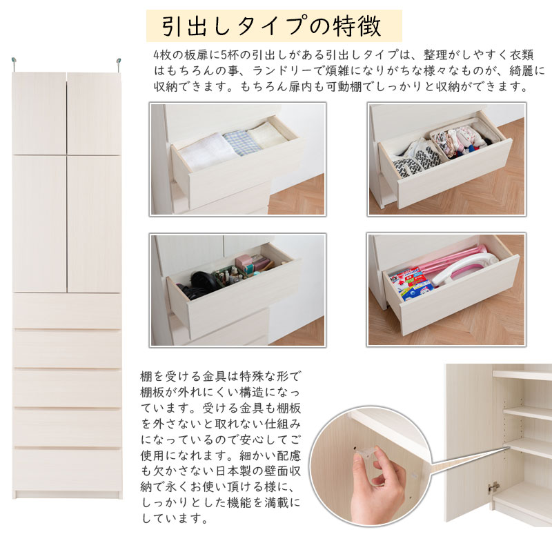 日本製 完成品 壁面 薄型 ランドリーラック 引出しタイプ ナチュラル アンティーク 完成品 地震 つっぱりラック 突っ張り チェスト ハイタイプ 木目調 木製 おしゃれ 北欧 国産 引き出し 収納【送料無料】