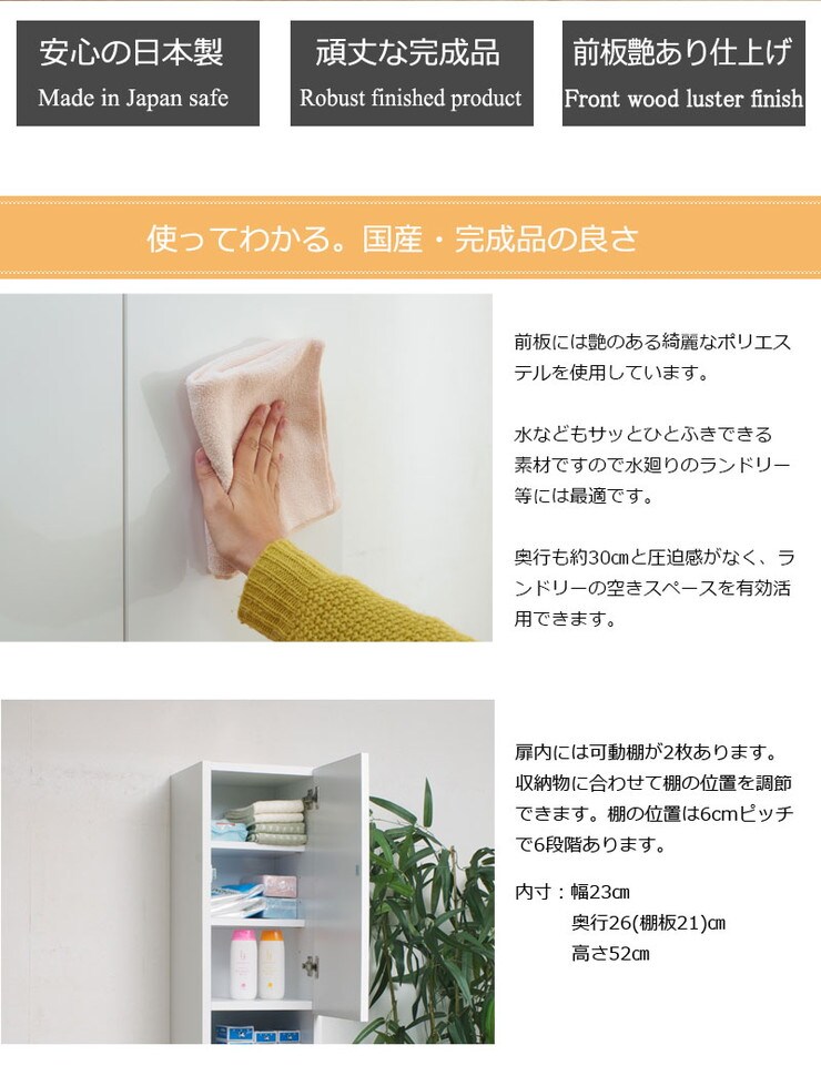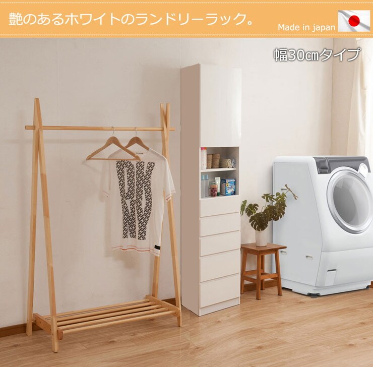 ■商品について/前板には水に強く、汚れもサッと拭き取れる光沢のあるポリエステルを使用。ランドリー廻りを整頓でき、常に綺麗に保てます。ランドリーに欠かせないのは、収納量。仕分けに便利な多引出し付きで、尚且つ奥行30cmの省スペース設計。