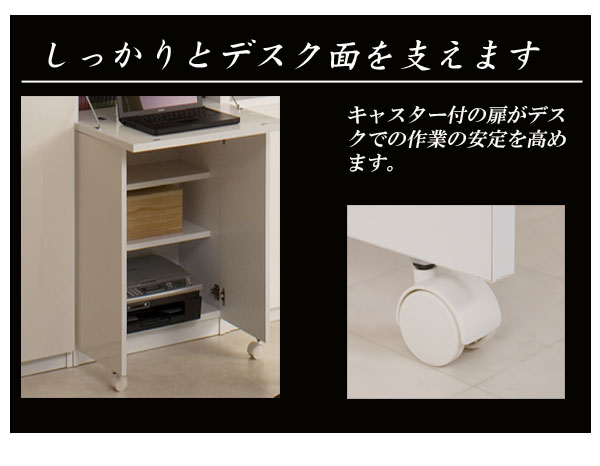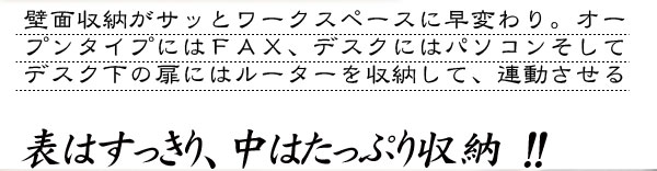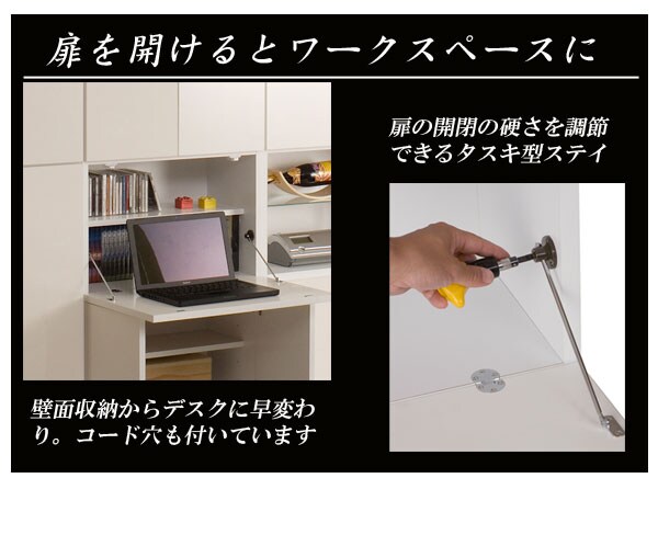 | 可動棚/7枚(6cmピッチ(上)3段階(中)9段階(下)6段階(デスク部)3段階) ※デスク部内の可動棚は、背板と約1cmの隙間を設け配線が通るように設計しています。 耐荷重量/デスク部天板約10kg、棚板:約5kg コード穴/デスク部・下扉内に各1箇所背面に巾木よけ加工 |
