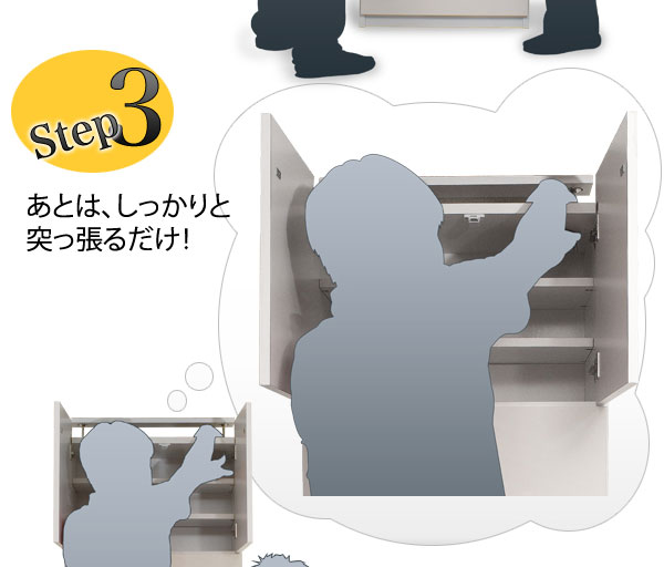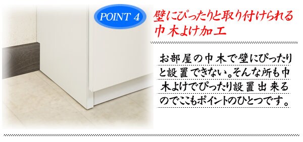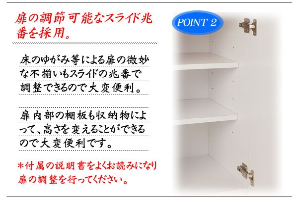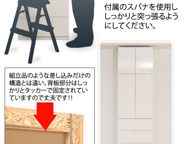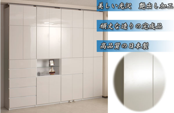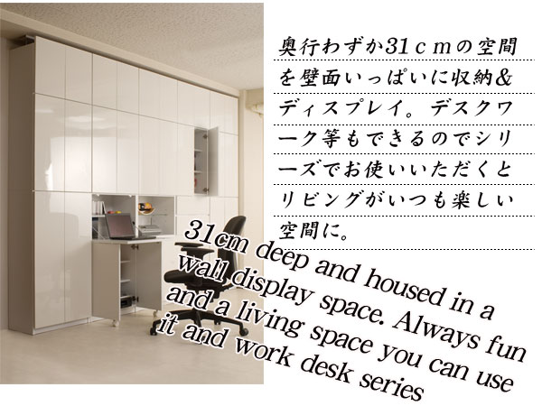 | 見せる・隠すを兼ねたシンプルモダン壁面収納シリーズ。用途に合わせて選べる備え付けの様な壁面収納4タイプ。ホワイト色は前面には白く輝くキズや汚れに強い艶出しポリエステルを採用。高級感と清潔感を兼ね備えた美しい艶出しのホワイトでお部屋を明るく、そして華やかな空間へと演出します。ポリエステル素材はプリントよりもキズや水に強く リビングで長くお使い頂けます。更に扉には調節可能なスライド蝶番を採用。床のゆがみ等による扉の微妙な不揃いもスライド蝶番で調整できるので大変便利。薄型だけど天井にしっかりと突っ張って固定するので安心、壁に穴を開ける事もなく賃貸マンション等でも大丈夫です。更にお部屋の巾木で壁にぴったりと設置できない。そんな所も巾木よけでぴったり設置出来るのでここもポイントのひとつです。多機能・大量収納等良いとこ満載の壁面収納をシリーズで。 |