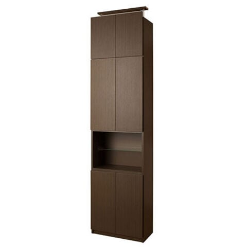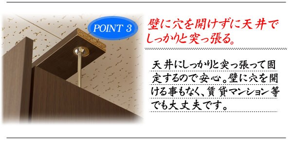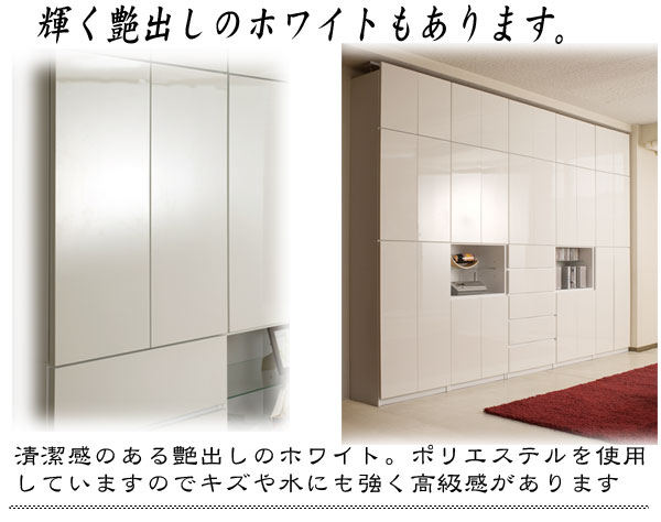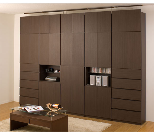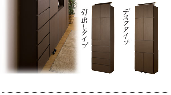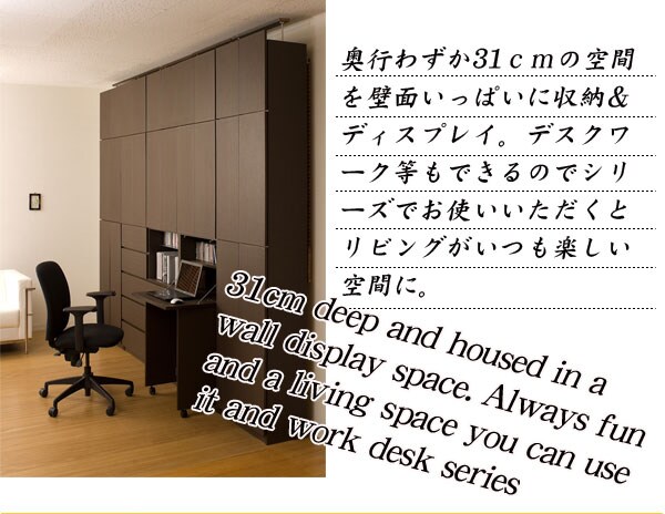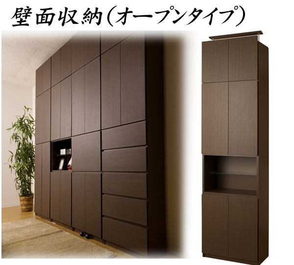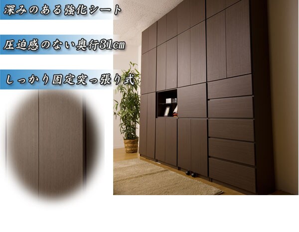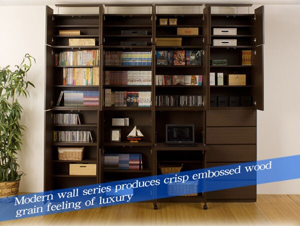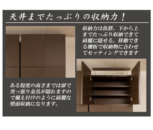 | 見せる・隠すを兼ねたシンプルモダン壁面収納シリーズ。用途に合わせて選べる備え付けの様な壁面収納4タイプ。ダークブラウン色は前面にはキズに強く天然木突板のような風合いの強化プリント紙を採用。高級感とモダンデザインを兼ね備えた華やかな空間へと演出します。更に扉には調節可能なスライド蝶番を採用。床のゆがみ等による扉の微妙な不揃いもスライド蝶番で調整できるので大変便利。薄型だけど天井にしっかりと突っ張って固定するので安心、壁に穴を開ける事もなく賃貸マンション等でも大丈夫です。更にお部屋の巾木で壁にぴったりと設置できない。そんな所も巾木よけでぴったり設置出来るのでここもポイントのひとつです。多機能・大量収納等良いとこ満載の壁面収納をシリーズで。 |