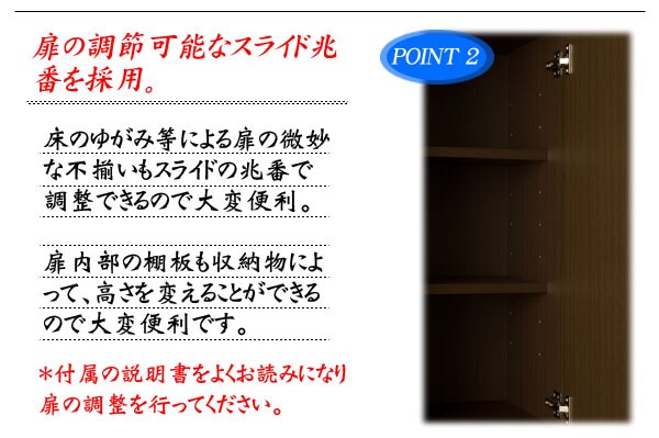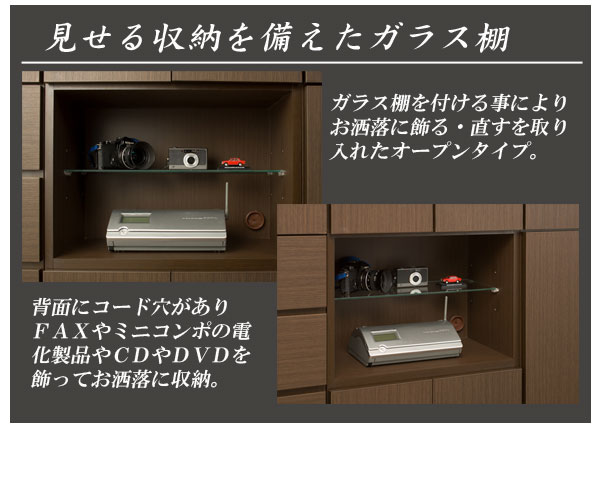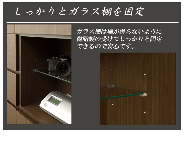| 可動棚/7枚(オープン部1枚・6cmピッチ3段階、扉内6枚・6cmピッチ(上)3段階(中)9段階(下)6段階) ※オープン部の可動ガラス棚は、背板と約1cmの隙間を設け配線が通るように設計しています。 耐荷重量/棚板:約 5kg コード穴/オープン部・下扉内各1箇所、背面に巾木よけ加工 |