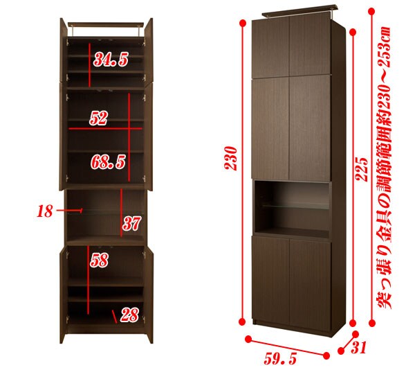 | 本体:(約)幅59.5×奥行31×高さ230(立上がり扉高さ5cm含む)cm 突っ張り高さ調節範囲:(約)230~253cm 扉内内寸:(約)幅52×奥行28×高さ(上)34.5(中)68.5(下)58cm オープン部内寸:(約)幅52×奥行28×高さ37cm |