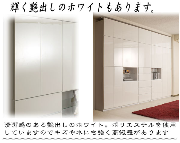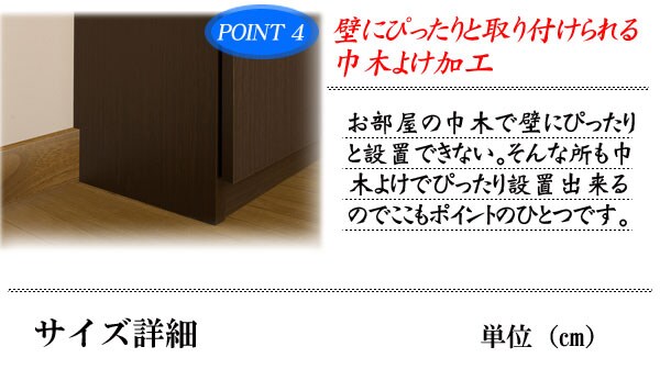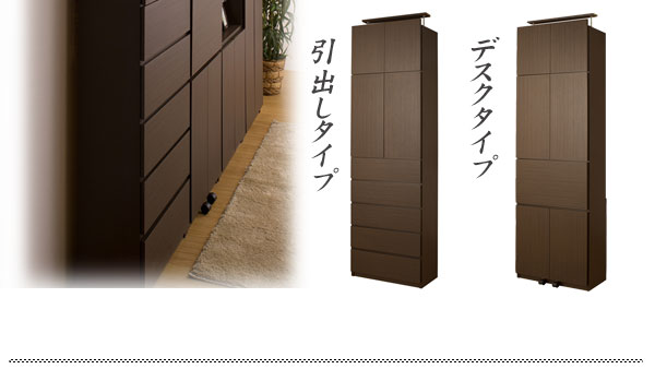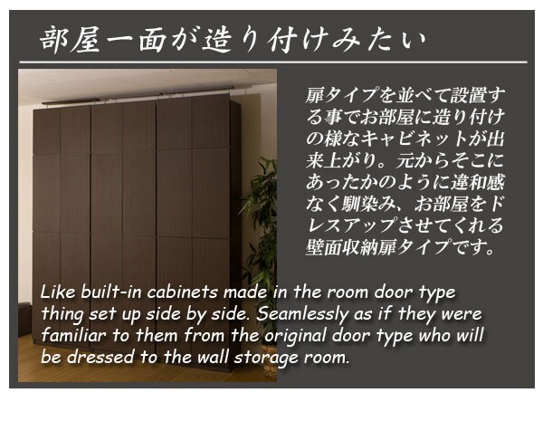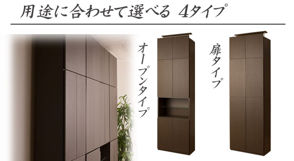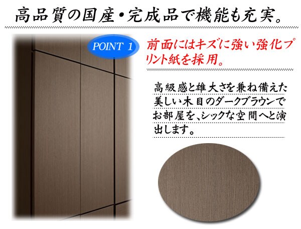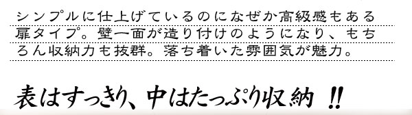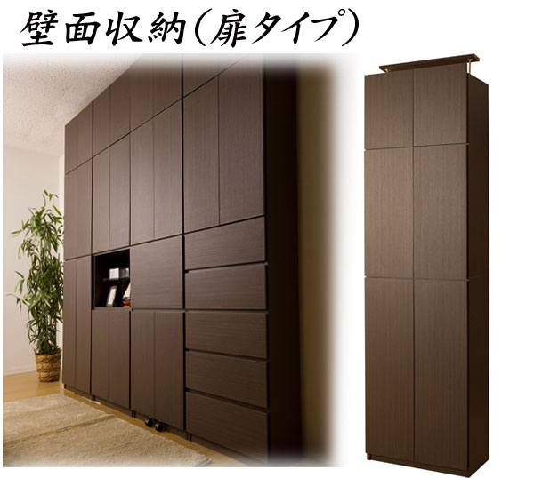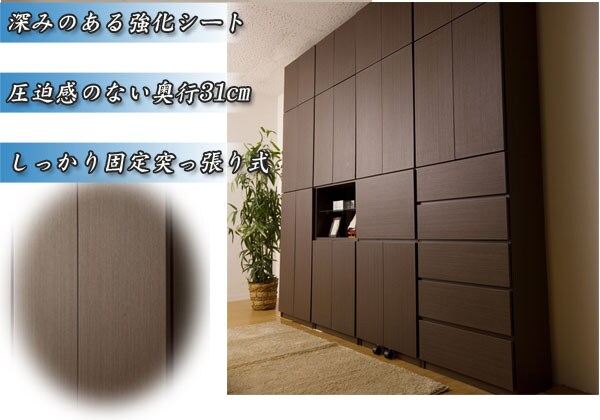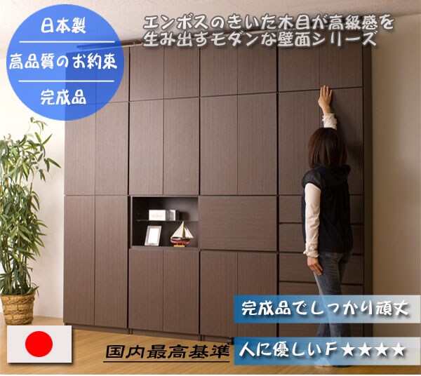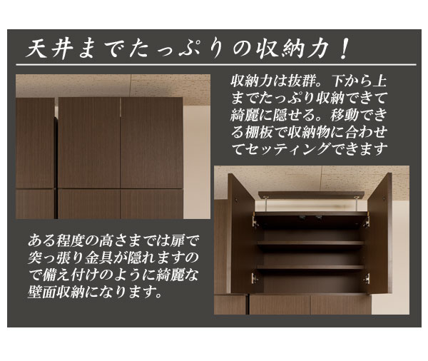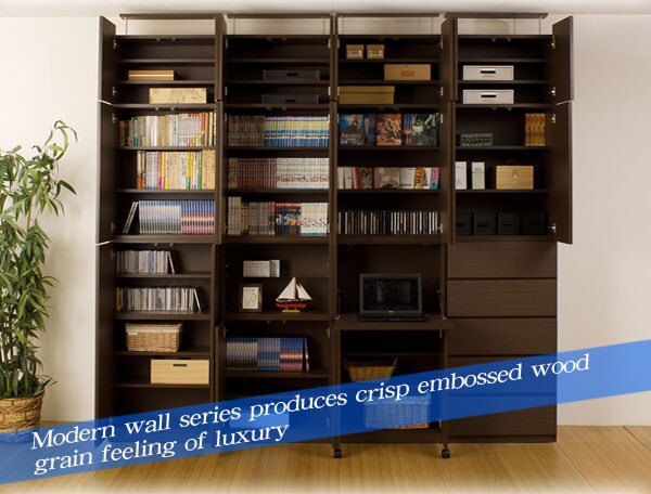 | 見せる・隠すを兼ねたシンプルモダン壁面収納シリーズ。用途に合わせて選べる備え付けの様な壁面収納4タイプ。ダークブラウン色は前面にはキズに強く天然木突板のような風合いの強化プリント紙を採用。高級感とモダンデザインを兼ね備えた華やかな空間へと演出します。更に扉には調節可能なスライド蝶番を採用。床のゆがみ等による扉の微妙な不揃いもスライド蝶番で調整できるので大変便利。薄型だけど天井にしっかりと突っ張って固定するので安心、壁に穴を開ける事もなく賃貸マンション等でも大丈夫です。更にお部屋の巾木で壁にぴったりと設置できない。そんな所も巾木よけでぴったり設置出来るのでここもポイントのひとつです。多機能・大量収納等良いとこ満載の壁面収納をシリーズで。 |