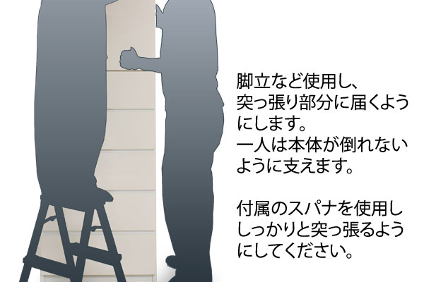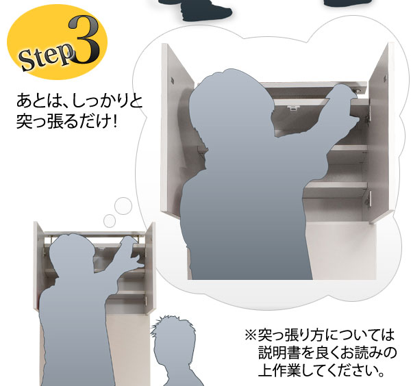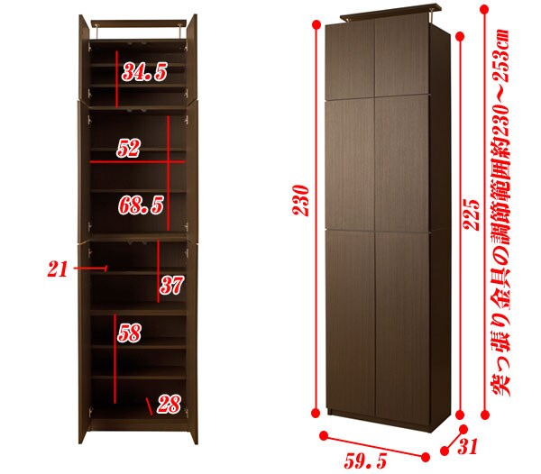 | 本体:(約)幅59.5×奥行31×高さ230(立上がり扉高さ5cm含む)cm 突っ張り高さ調節範囲:(約)230~253cm 扉内内寸:(約)幅52×奥行28×高さ(上)34.5(中)68.5(下)固定棚~上37・固定棚~下58cm |