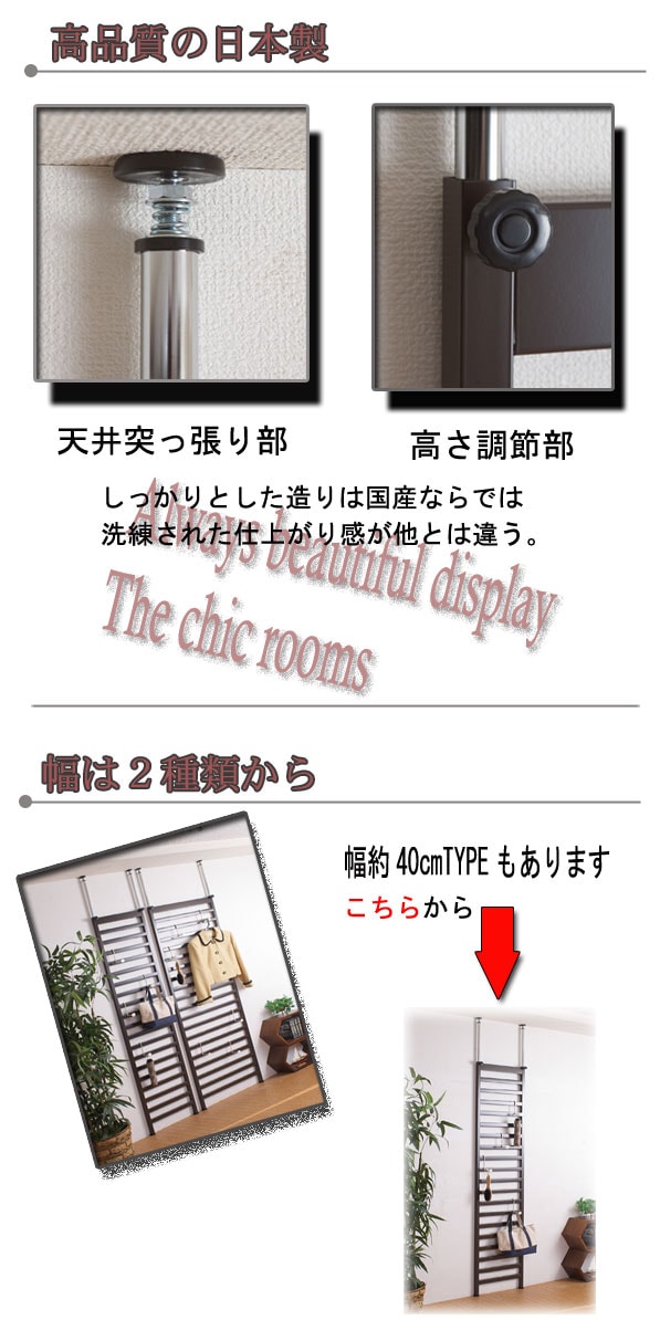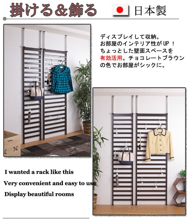 | ディスプレイして収納。 そんな言葉が似合うパーテーションでお部屋のインテリア性をUP! ちょっとした壁面スペースを有効活用でき、チョコレートブラウンの色がお部屋をシックにしてくれます。 しっかりした造りは国産ならではで、洗練された仕上がり感が他とは違います。 天井に突っ張って設置できますので安定感抜群。 |