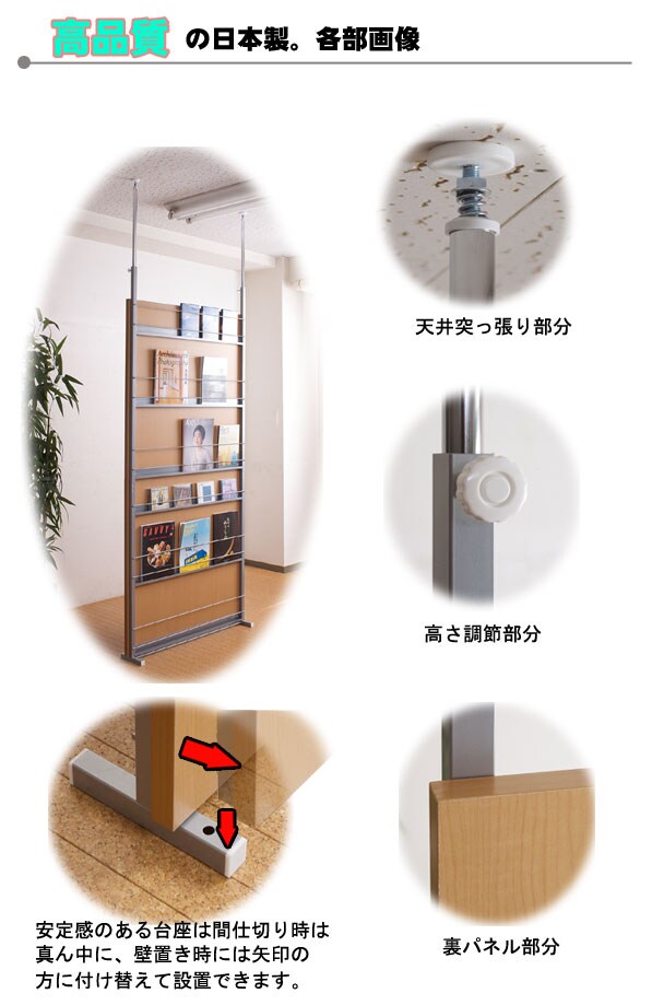 | 間仕切り仕様の突っ張りラック。 雑誌やCDを飾れる面と目隠しの仕切りの両面でお部屋にアクセント。 国産品で品質も◎。 脚の部分は壁に置くときと間仕切りにする時に付け替えて使用できるようになっています。 幅は2サイズでリビングやキッチン等、さまざまな空間で活躍し、あなたのお部屋を演出します。 |
